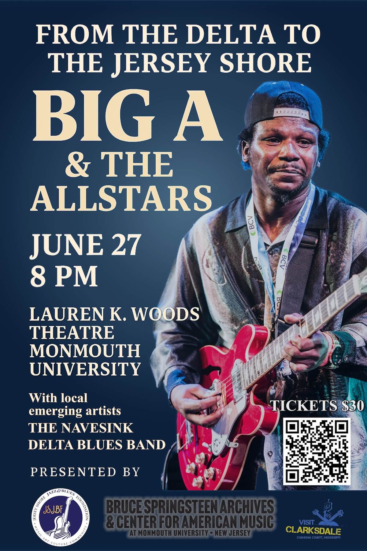 The Jersey Shore Jazz & Blues Foundation (JSJBF), a non-profit organization supporting and preserving jazz and blues in New Jersey, is proud to partner once again with the Bruce Springsteen Archives & Center for American Music and Visit Clarksdale, as we bring back by popular demand Big A and the Allstars! Opening the show will be the Jersey Shore’s own emerging artists, The Navesink Delta Blues Band.