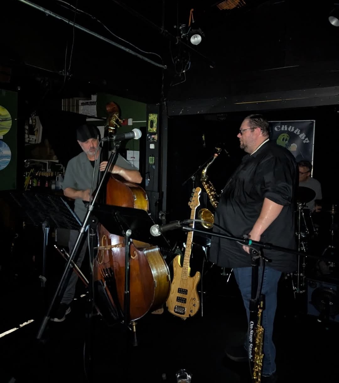 Anticipation ran high for the debut of the new jazz quartet formed by JSJBF board member Jay Sweet, at the Jazz Café. With a stormy forecast predicted, I was a little apprehensive when I got a text from our favorite bartender at the Chubby Pickle, Erin O’Keefe, that there was a partial power outage in the area. Undaunted, we set out, only to arrive to a total blackout! As there was still some daylight, the emergency lights were working, and the band was set up to play, the decision was made to start an acoustic set.